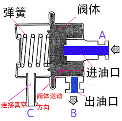 先大致的說一下噴油壓力與缸壓關系:發動機的進氣量越大(進氣總管的真空度越。,缸內壓力就越大,需要的噴油壓力也就越大。舉個兩個工況例子:發動機在怠速時節氣門是全關的,只通過旁通氣道提供進氣量,此時總管內部的產生較大的真空,燃油壓力調節器通過一根軟管與進氣總管一側相連,利用產生的真空使燃油壓力調節器空腔中的膜片,克服彈簧的作用力向左移動。閥體也隨之離開閥座,使A、B倆油道相通完成泄壓(即燃油壓力調整)。在高轉速時氣門是全開的,由于進的空氣多,進氣總管內部的真空度較小,產生的吸力微乎其微,燃油壓力調節器空腔內部的膜片只做微小調整甚至不做調整。由此可看得出發動機轉速越高,進氣量也隨之變大,需要的噴油壓力也就越大。燃油壓力調節器正是巧妙的利用這一點,來控制發動機各工況下所需的燃油壓力。我想當那些工程師完成該項研發時,一定是舉杯慶祝的。!