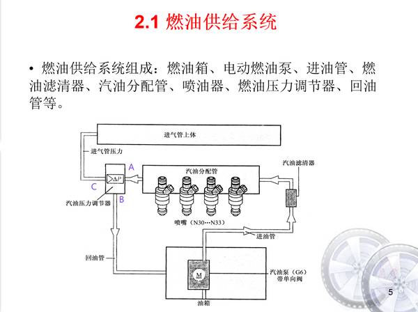 首先燃油導軌里邊一直都是有壓力的,回油管只是一根普通的油管子,真正起調節壓力(泄掉一部分壓力)作用的是燃油壓力調節器。從圖上內看得出來,它有三個接口:A端連接燃油導軌,B端連接燃油箱,C端通過黑色的小軟管連接進氣總管(節氣門之后,進氣歧管之前那一段)。